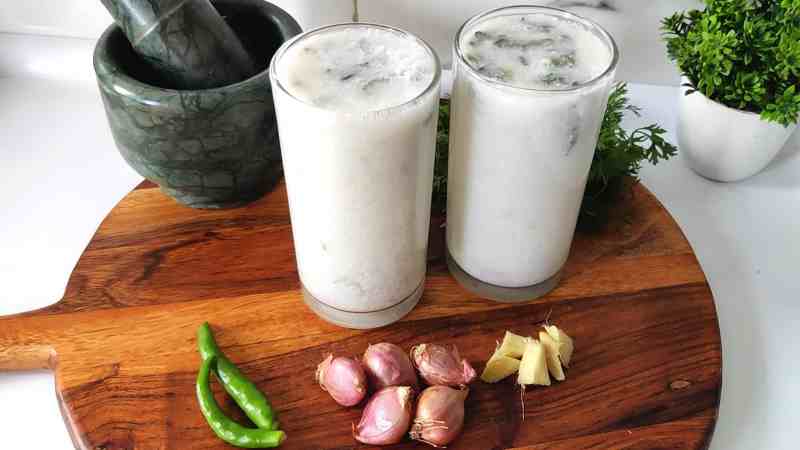 Sambharam is a refreshing South Indian drink made with a blend of yogurt, water, shallots, green chilies, curry leaves, ginger, and spices that offers a tangy, sour, and slightly spicy taste with a cooling effect on the palate.